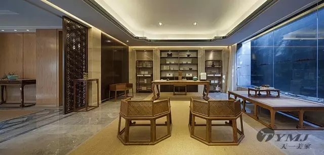 东方美学讲究对称,客厅家具的对称摆法让空旷的客厅空间形成较好的围合感,高档家具茶几高耸书柜里的书籍、工艺品的陈列既彰显又吻合空间主人对国学文化热衷且造诣深厚的人物定位,结合灰蓝调水墨韵的地毯、空间的青绿色调的饰物,目的指向东方情调的营造。
